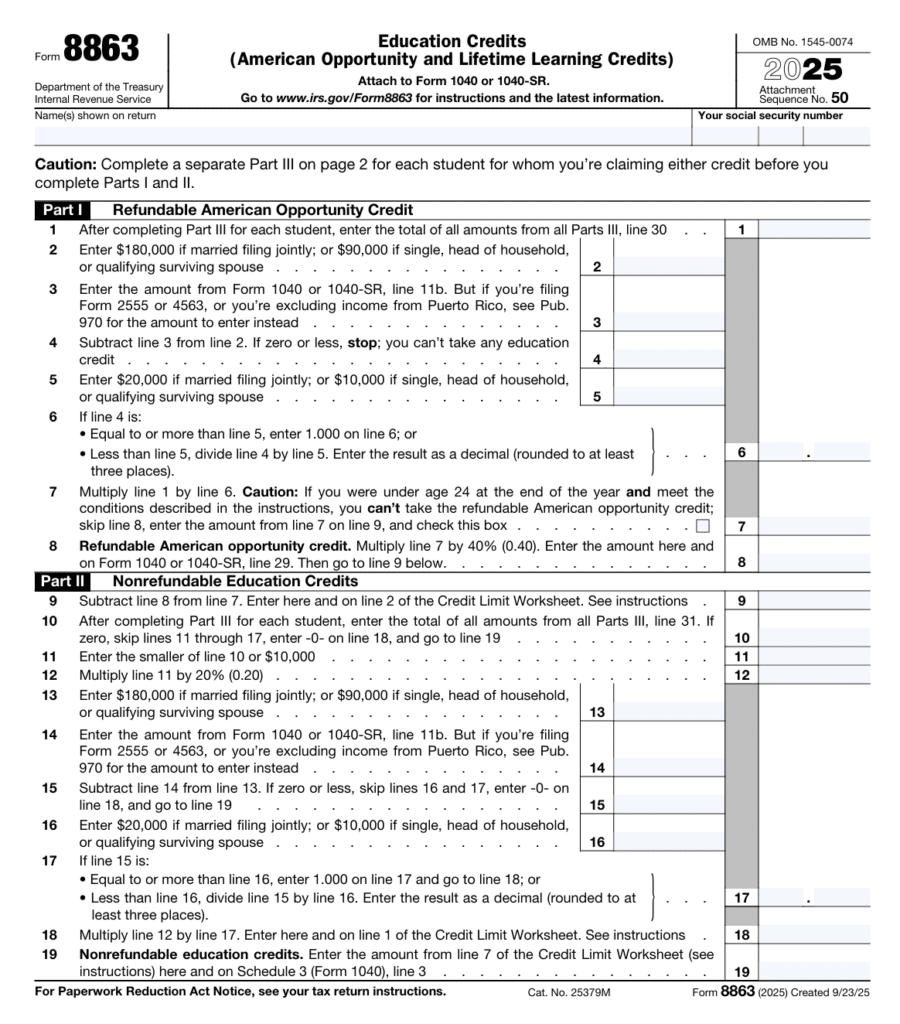 Form 8863 is two pages with three parts. Work through them in this order: